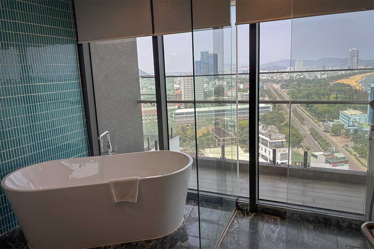 Modern Quy Nhon hotel bathroom with panoramic glass windows overlooking the city skyline and coastline, offering luxury sea-view stays.