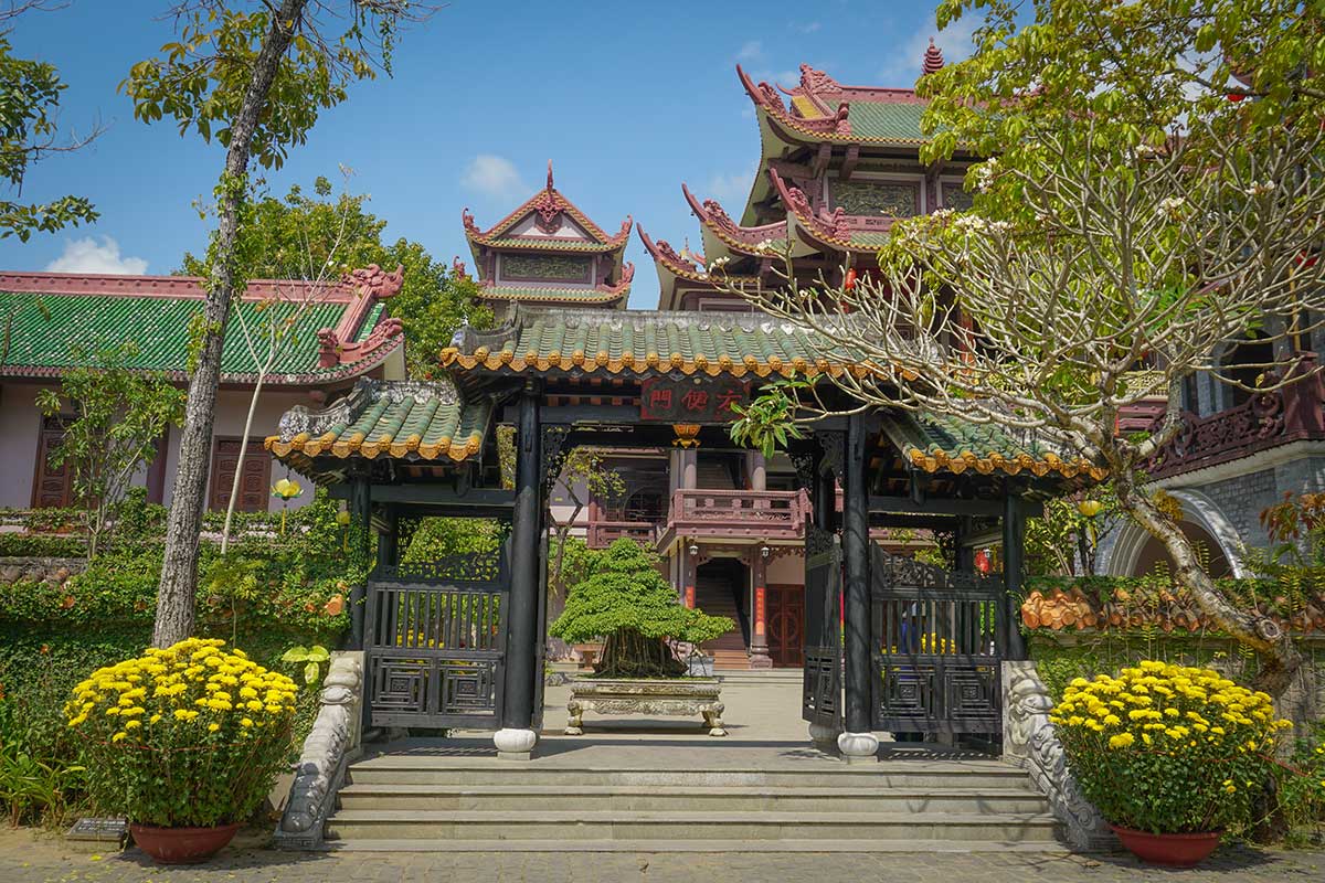 Entrance to Thien Hung Pagoda outside Quy Nhon, featuring traditional curved roofs, bonsai trees, and colorful temple architecture.