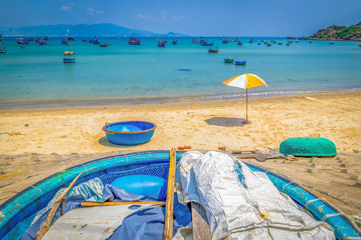 Nhơn Lý Beach with round fishing boats and umbrellas on the sand, near Eo Gió Quy Nhon