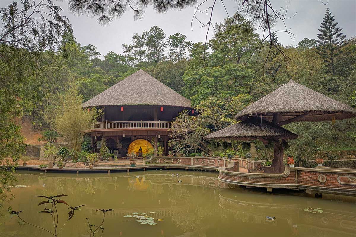 The main hall is modeled after Hue’s traditional wooden “ruong house” architecture, with its simplicity emphasizing natural materials rather than ornate decoration.