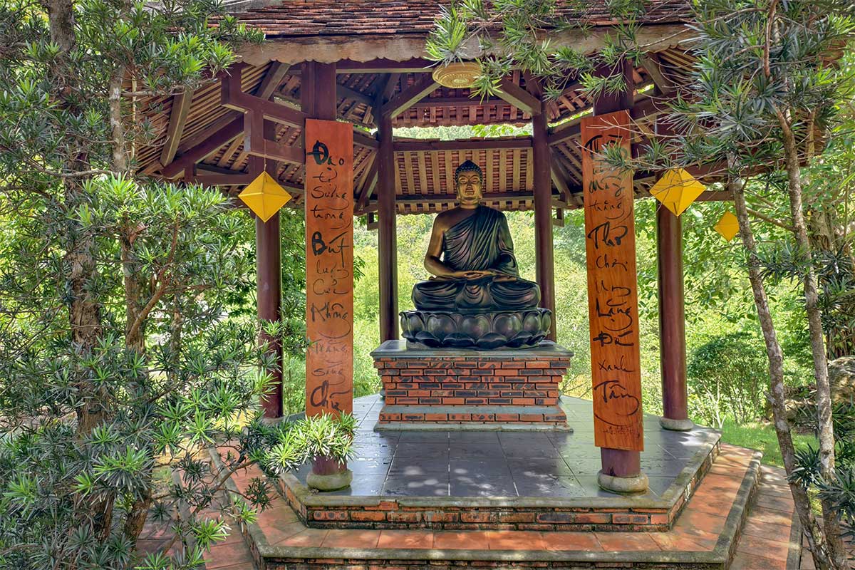 The monastery was founded in 1989 by Venerable Gioi Duc, following the Theravada Buddhist tradition. Unlike many other pagodas in Vietnam, it was designed without the iconic Tam Quan triple gate. Instead, the architecture takes inspiration from Hue’s traditional wooden “ruong houses,” blending seamlessly with the natural surroundings. Its purpose was never to impress with grandeur but to cultivate an environment for meditation, reflection, poetry, and calligraphy—values that remain central to the monastery today.