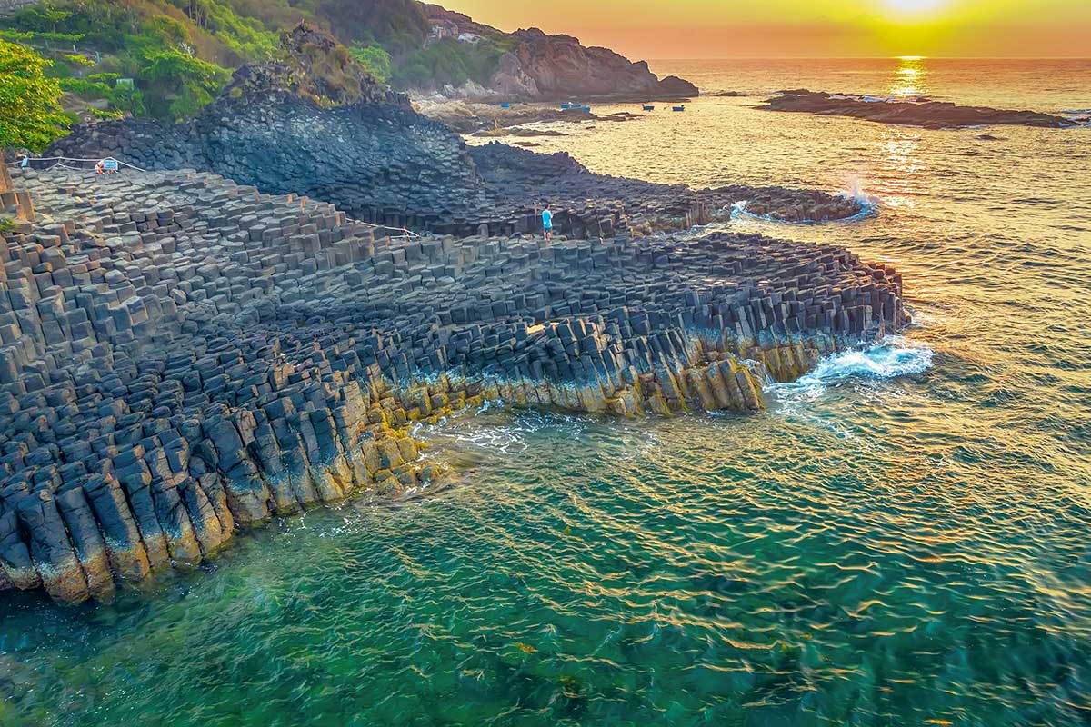 Da Dia Reef is particularly photogenic when the light is soft. At sunrise and sunset, the basalt columns shift in color, from jet black to reddish or golden tones depending on the angle of the sun. Midday can feel harsh, but shadows highlight the geometric patterns. If you fly a drone, be mindful of crowds and local sensitivities — wind along the coast can also make conditions tricky.