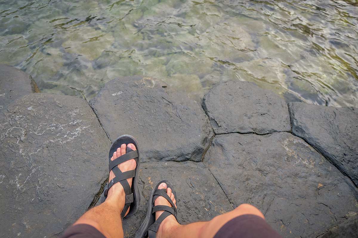 From the entrance, it’s only a short walk along a paved path before you reach the basalt formations. The main cluster is where most people gather for photos — a jagged black platform meeting the turquoise sea.