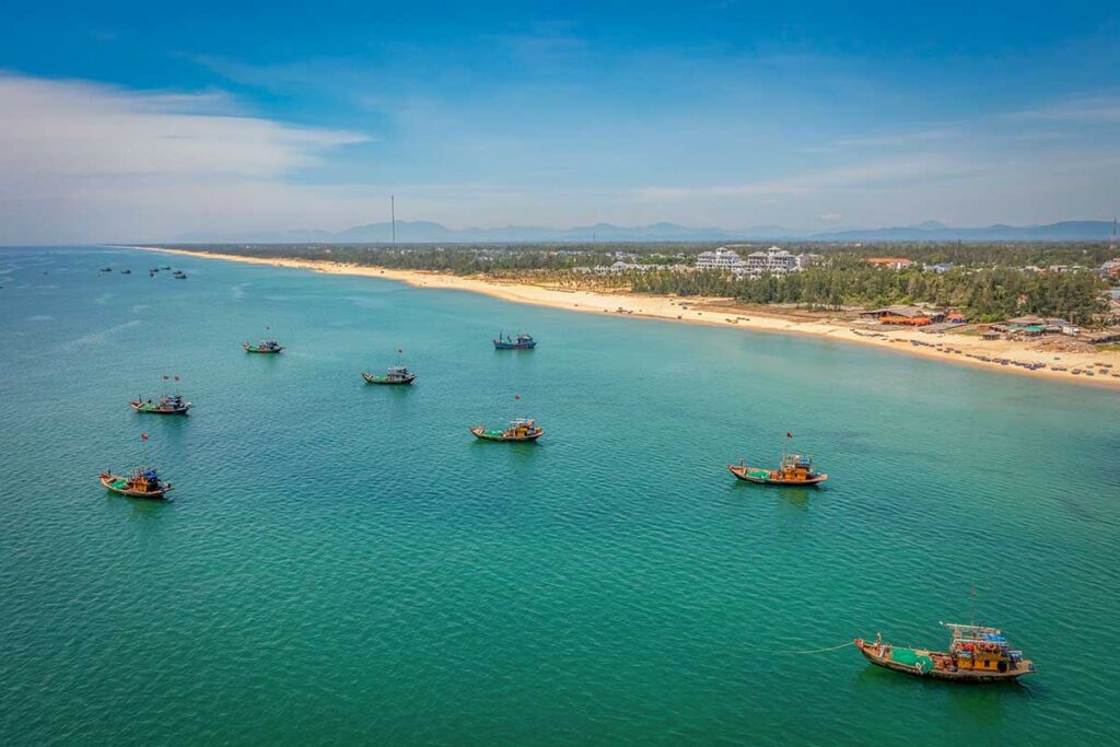 The beach itself is wide and sandy, with gentle waves and shallow water that make it pleasant for swimming or quiet walks. Parts of the coast remain undeveloped, while others are slowly changing as new resorts and roads appear. Early in the morning, you’ll see local fishermen setting out or returning with their catch, sometimes using round basket boats typical of central Vietnam. The mix of simple fishing life and light development gives the place a raw but authentic charm—calm, real, and very different from the polished beach scene closer to Hoi An.
