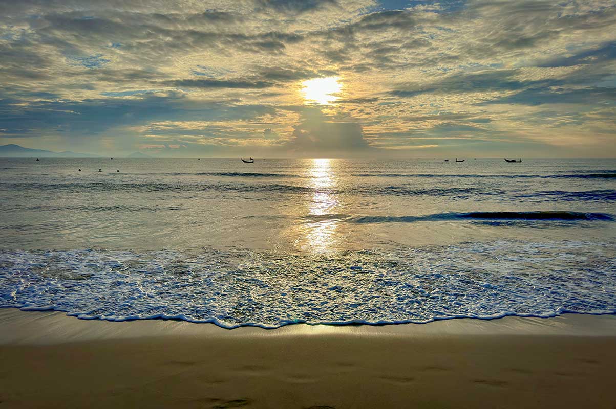 The beach itself is wide and sandy, with gentle waves and shallow water that make it pleasant for swimming or quiet walks. Parts of the coast remain undeveloped, while others are slowly changing as new resorts and roads appear. Early in the morning, you’ll see local fishermen setting out or returning with their catch, sometimes using round basket boats typical of central Vietnam. The mix of simple fishing life and light development gives the place a raw but authentic charm—calm, real, and very different from the polished beach scene closer to Hoi An.