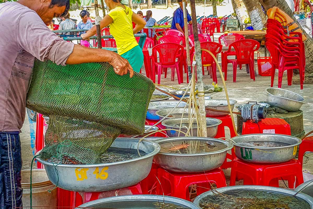 If you stay overnight, you’ll probably eat where you stay — and that’s usually a good thing. Most homestays serve freshly caught seafood: grilled squid, clams, and fish cooked with lemongrass or tamarind. Menus are small and service unhurried, but the food is honest and local.
