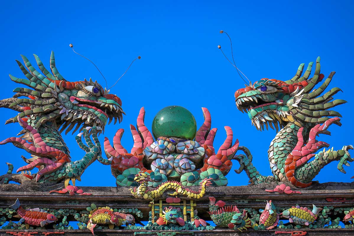 The striking entrance gate features three arched doorways, symbolizing Heaven, Earth, and Humanity. In line with traditional feng shui, the side doors are for everyday use, while the central arch — often kept closed — is reserved for deities and special rituals. The gate is topped with mythical creatures, including dragons and phoenixes, and decorated with colorful porcelain tiles that set the tone for what’s inside.
