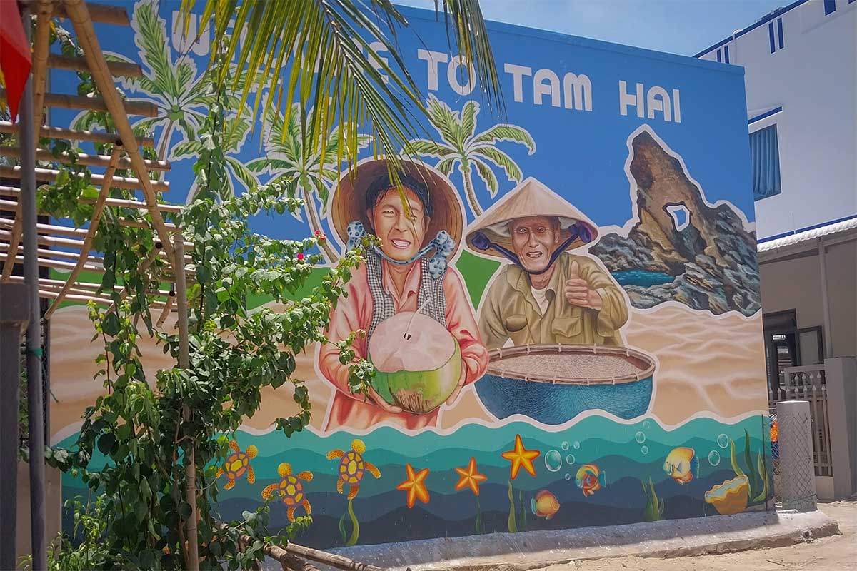 One of the small northern villages has been painted with bright seaside murals by local students. The artwork depicts fishing life, boats, and marine creatures, adding color to otherwise simple homes. It’s worth a short stop while exploring by bike or motorbike, but keep expectations modest — it’s more a nice surprise than a major attraction.