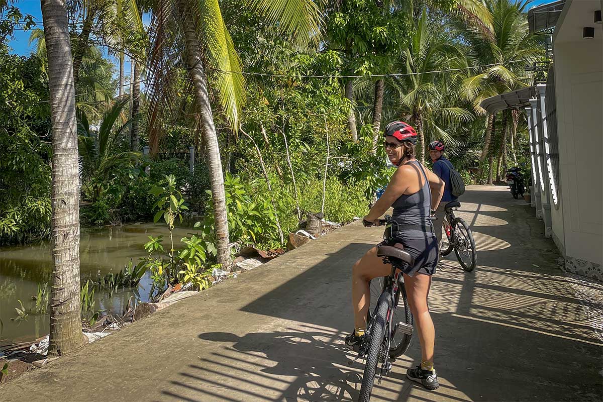 Cycling in Can Tho countryside – Traveler on a bicycle exploring shaded rural paths lined with coconut palms and canals.